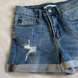 Kancan mid rise medium wash distressed five pocket size 5 size 26 jean shorts