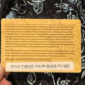 This is a gorgeous purse from Patricia Nash! This is the Zancona bag from the heritage collection, comes with the original authenticity card. A mixed silver and black floral style, has a western cowgirl vibe, and a brown suede interior. In excellent condition, a few minor marks but nothing noticeable.
