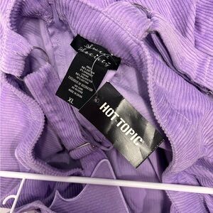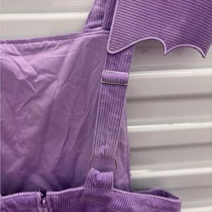 The NWT XL Sweet Society Juniors' Kawaii Bat Corduroy Skirtall Skirt Overalls with Wings is a stylish and unique piece perfect for various occasions such as travel, parties, or casual wear. Made from a blend of spandex and cotton in a solid purple color, this skirt features embroidered wings accents and a zip closure. The short skirt length and skater style make it a trendy choice for juniors who love the anime, punk, or gothic themes. It also includes pockets and is suitable for all seasons, making it a versatile addition to any wardrobe.