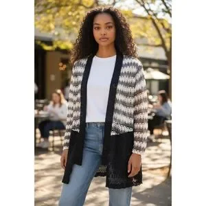 Chic open-front cardigan with a striped pattern. Perfect for layering over casual outfits.