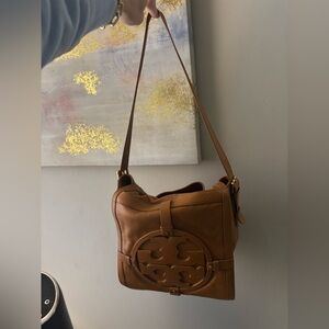 Elegant Tory Burch shoulder bag. Smooth tan leather. Spacious interior with pockets.