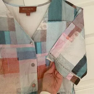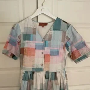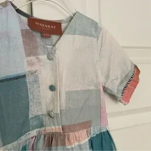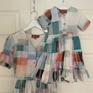 TWO worn once JessaKae mommy and me dresses in sizes small and 2/3T / Small hits midcalf and I am 5‘8 / toddler style in my opinion runs big / super fun modern print with fabric buttons and cute knit sleeves / the small dress is pretty heavy and would not advise wearing it on a hot day