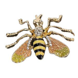 Add a touch of charm and sparkle to your outfit with this eye-catching bee brooch. Crafted with gold-tone metal, this brooch features detailed black and yellow enamel stripes, shimmering rhinestone accents on the head and thorax, and beautifully enameled wings in shades of green and peach. A statement accessory is perfect for jackets, blazers, scarves, or hats.
