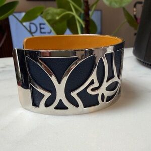 Elegant silver and black cuff bracelet with a unique design. Perfect for adding a touch of sophistication to any outfit.