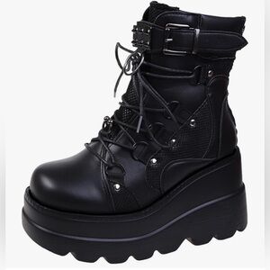 These boots are SUCH a vibe. Super edgy, slightly goth / punk aesthetic with a modern chunky platform. Perfect with mini skirts, oversized sweaters, straight-leg jeans, or an all-black fit.