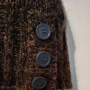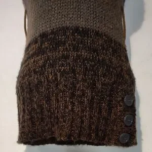 Stylish cowl neck with button details. Warm brown and purple shades. Perfect for cozy layering.