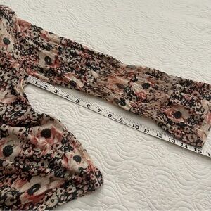 - Metallic thread sheer floral print material along neckline and tiered sleeves.