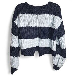 Stay cozy and stylish with this striped navy and blue sweater. Perfect for layering and adding a chic touch to any outfit.