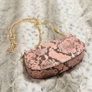 Elegant and classy clutch with a pink snakeskin pattern. Features gold chain strap and MK logo charm. Ideal for evening cocktail parties or brunch. A cute purse big enough for my iPhone 16 Pro Max and other essentials.