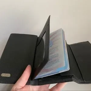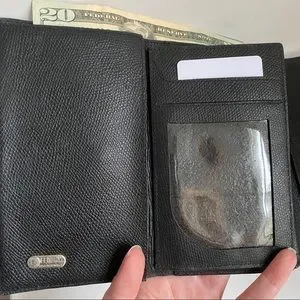 6 pockets. room for full size money & passport if traveling. 3 cc slots w room to add separate plastic card holder insert if needed. snap close. unisex. GUC.