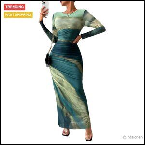 Printed Bodycon Maxi Dress Long Sleeve Mesh Ruched Elegant Cocktail Party Wear
