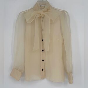 Zara Organza Bow Blouse Cream Sheer Button Front Top XL
