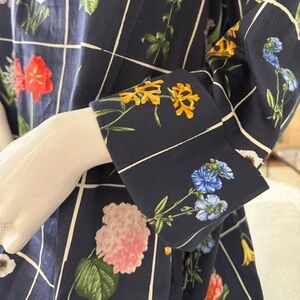 Worn just once to a garden party. Got lots of compliments! Perfect for the spring and summer. Tuckernuck makes quality clothing that lasts. I kept the tags and they will come with dress. 27” from under arm to bottom of dress, 17” from shoulder to shoulder. Sleeves are 3/4 with tacked cuff. Such a fun dress to wear. Unlined. XL base is deep navy with vibrant flowers all around.