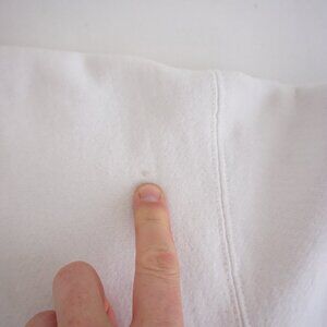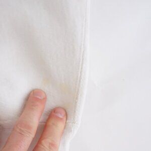 Model is 5'5", 130 lbs, 30D, with a 27" waist. It’s lightly worn; just like to disclose it is preowned/preloved. Few marks and yellowing due to age and being white