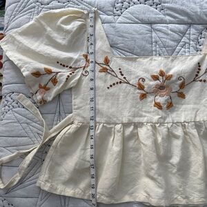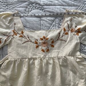 Enchanting cropped blouse with embroidered flowers and leaves and an attached tie at the waist. Empire waist/babydoll fit with wide loose sleeves. Made in Italy from recycled materials (feels like cotton and/or linen blend). No elastic and no stretch throughout.