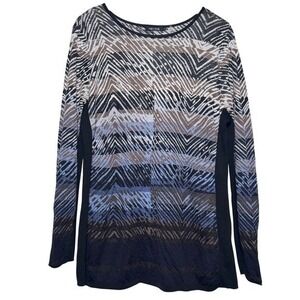 Keywords: NIC+ZOE, long sleeve top, knit top, chevron print, multi color top, women's top, XL, extra large, casual top, business casual, black top, brown top, blue top, patterned top, designer top