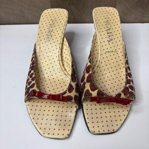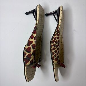Prada red, cream and navy canvas leather heart mules. Red patent leather bow detail at toe box.