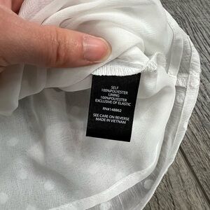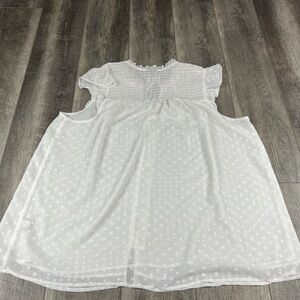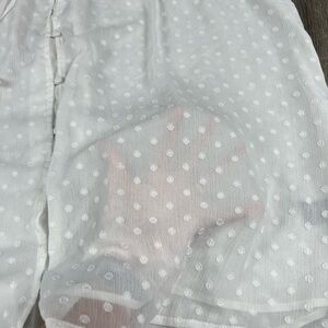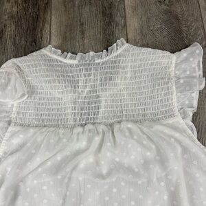 Lightly worn but in good condition. White semi sheer material with polka dot like partner. Smocked section across shoulders. Ruffle details along sleeves. Button details down the front. Refer to pictures for measurements. Polyester material