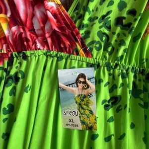 This vibrant green maxi dress features a stunning floral design, perfect for any occasion. Enjoy the comfort and style of this beautiful piece.