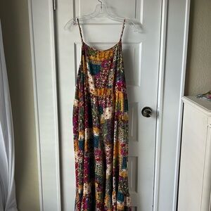 Sunny, flowy jumpsuit by natural life. Has a mixture of colors and patterns that gives that summer, bohemian look. Features a wide leg silhouette with interior pockets in the front. 100% rayon. Fits true to size at bust with an oversized look.