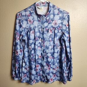 Sears Womens Vintage 70s Blue Floral Buttonfront Shirt-Size 16