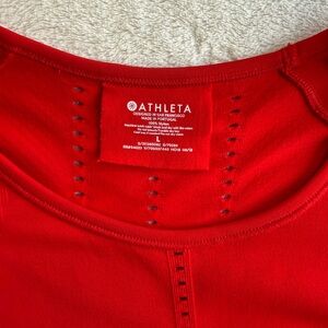 Vibrant red Athleta performance long sleeve with breathable laser-cut detailing. Lightweight, fitted athleisure, breathable top perfect for running, gym, and everyday sporty chic style.