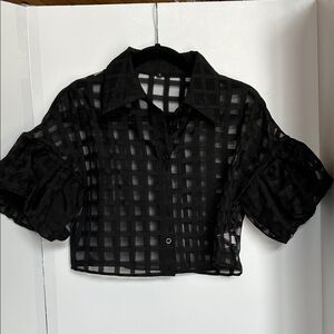 Elevate your style with this chic black sheer checkered top. Perfect for any occasion, this top offers a modern and stylish look.