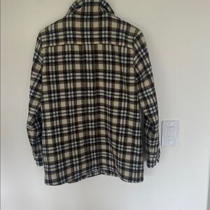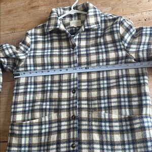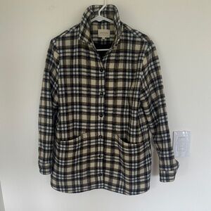 Authentic Sézane “Will” jacket in a timeless neutral plaid featuring cream, navy, and camel tones. A classic layering piece crafted from 100% virgin wool with a smooth lining for comfortable wear.