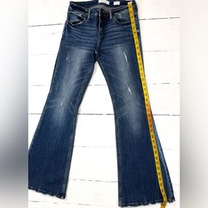 Chic dark blue jeans with a flared leg. Perfect for a trendy look. Comfortable fit for everyday wear.