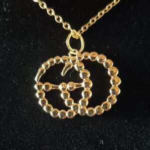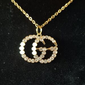 This stunning upcycled 18" gold necklace features a dazzling crystal emblem, perfect for elevating any ensemble with a touch of elegance.