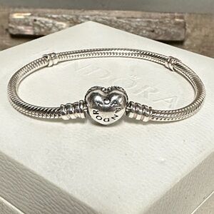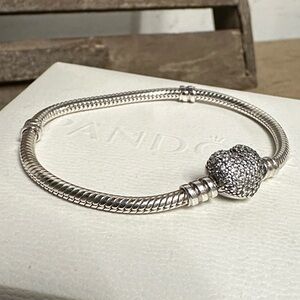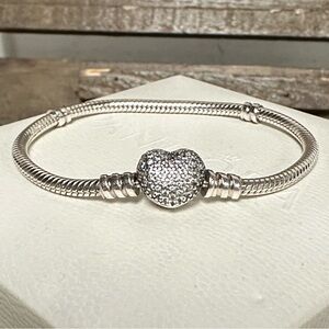 Authentic 6.3” 16cm Pandora great shape moments sparkling crystal cz pave heart snake chain starter charm s925 ale sterling silver stamped bracelet. Does not come with gift box. Comes with mesh gift bag.