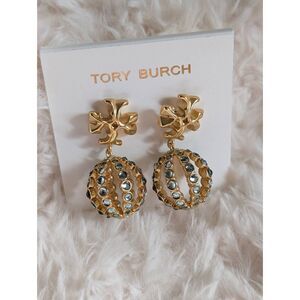 Tory Burch Roxanne double T logo crystal ball drop earrings. 18 k gold plated brass, earring post.
