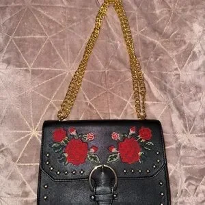 This chic black bag features vibrant floral embroidery and a stylish gold chain. Perfect for enhancing any outfit with elegance.