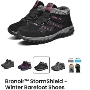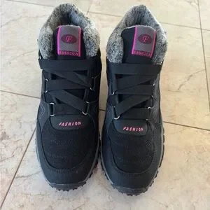 Cozy winter shoes with black and pink design. Features a warm fur lining and rugged sole.