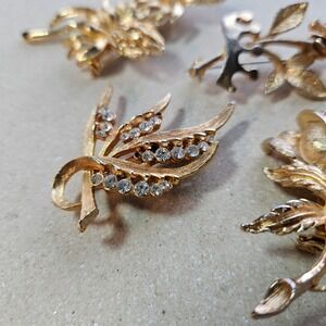 Collection of vintage gold-tone floral brooches features a variety of botanical designs, including roses, lilies, and abstract blossoms.