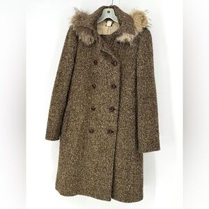 J. Crew vintage wool Brown Tweed Pea Coat with hood and Fur Collar size 10