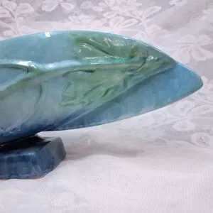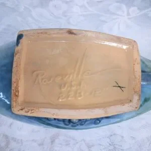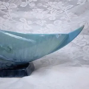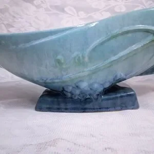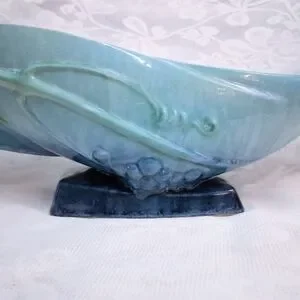 A wonderful piece of hand-made Roseville Pottery in beautiful, flowing form. Marked and signed on bottom; circa 1948. There is a chip on one side as seen in picture #5. No cracks or splits. Gorgeous glazed blue-green.