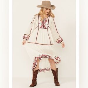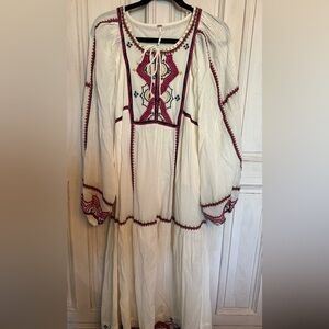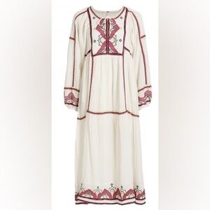 Artful embroidery echoes along the bodice, cuffs and hem of this worldly maxi dress boasting a relaxed fit. ~ Ties at neck ~ Long sleeves with elastic cuffs ~ Side pockets ~ Lined 60% viscose, 40% cotton with 100% polyester and 70% cotton, 30% metallic fibers contrasts Hand wash, line dry