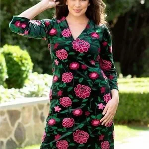 Elegant dress with vibrant pink floral patterns on a rich green background. Perfect for any occasion.