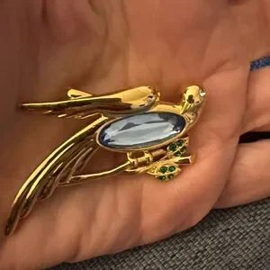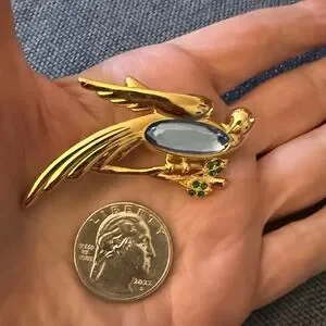 Vintage Monet gold tone bird brooch with large oval blue glass jelly belly center stone & green rhinestones embedded in the leaves. Also has blue rhinestone eyes.
