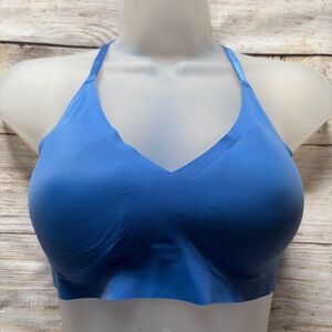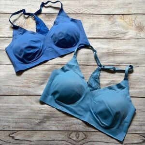 Bundle of two seamless laser cut racerback pullover bralettes: one blue, one light blue.