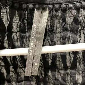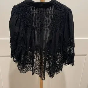 Elegant black lace top. Features button-up front. Intricate lace detailing on sleeves and hem. Perfect for a chic look.