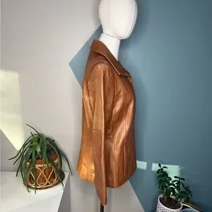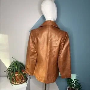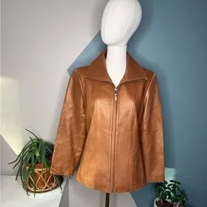 Jones New York Cognac Leather Jacket M Fitted Y2K Zip Tailored Caramel Blazer