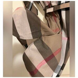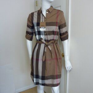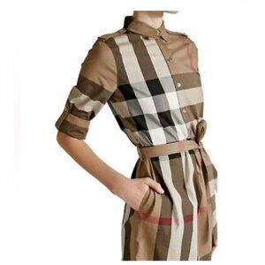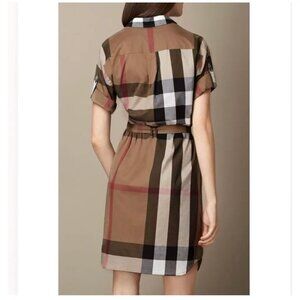 Stylish Burberry mini dress. Features classic plaid pattern. Button-up front with a belted waist. Perfect for casual outings.