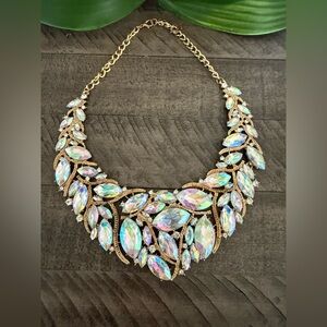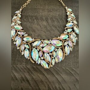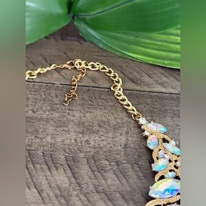 This stunning necklace features a gold chain adorned with iridescent stones, perfect for adding a touch of elegance to any outfit. There’s mild tarnishing near the hooks. It was only worn once. It’s like new and it looks so beautiful on.