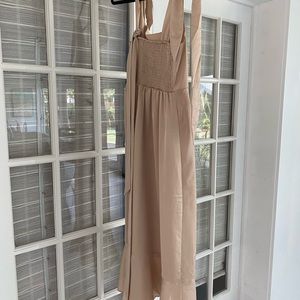 Elegant cream midi dress. Features tie straps and front slit. Perfect for special occasions.