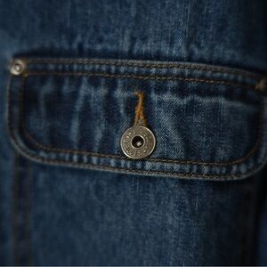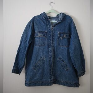 Classic 90s medium-wash denim jacket with attached denim hood and full zip front. Features button chest pockets, angled front pockets, and a relaxed longer fit — perfect for layering over tees, sweaters, or dresses.