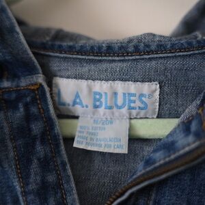 Keywords: vintage 90s denim jacket, LA Blues jacket, hooded jean jacket, women’s size 16 18, plus size vintage denim, retro streetwear, y2k jacket, grunge style coat, oversized denim jacket, medium wash jean jacket, 90s outerwear, casual layering piece