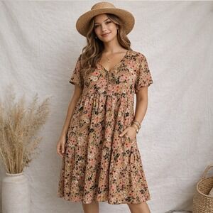Lightweight rayon fabric brings a breezy feel to this tiered midi dress, showcasing a vibrant all-over floral print in warm earth tones. Designed with a flattering V-neckline and a functional button-front bodice, it features a relaxed babydoll silhouette with short sleeves and convenient side pockets. The tiered skirt adds graceful movement and a touch of bohemian flair to the overall design. This garment is in excellent pre-owned condition. Perfect for garden parties, weekend brunches, or casual summer outings.