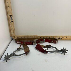 Vintage Leather Red Western Spur Strap Set with Silver Conchos and Chains